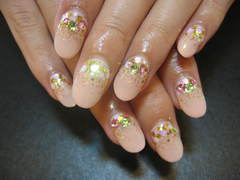 新着情報 / 2009.06.01 ♪お客様ネイル♪ 今回もお客様ネイルをご紹介させて頂きたいと 思います ベースはうすいピンクベージュを全体に そして根元からゴールドのラメをちりばめました さらにゴールドと白のホログラムでキラキラ感をプラスして上品な仕上がりになりました アクセントにストーンを置いたら完成ッッ 今回お客様にはしたいデザインの雑誌を持ってきて頂きました そのデザインに近づくようにベースの色も2色混ぜて作っちゃいました SORAではこんなことも出来ちゃうのでやりたいデザインがあればぜひご相談くださいッッ